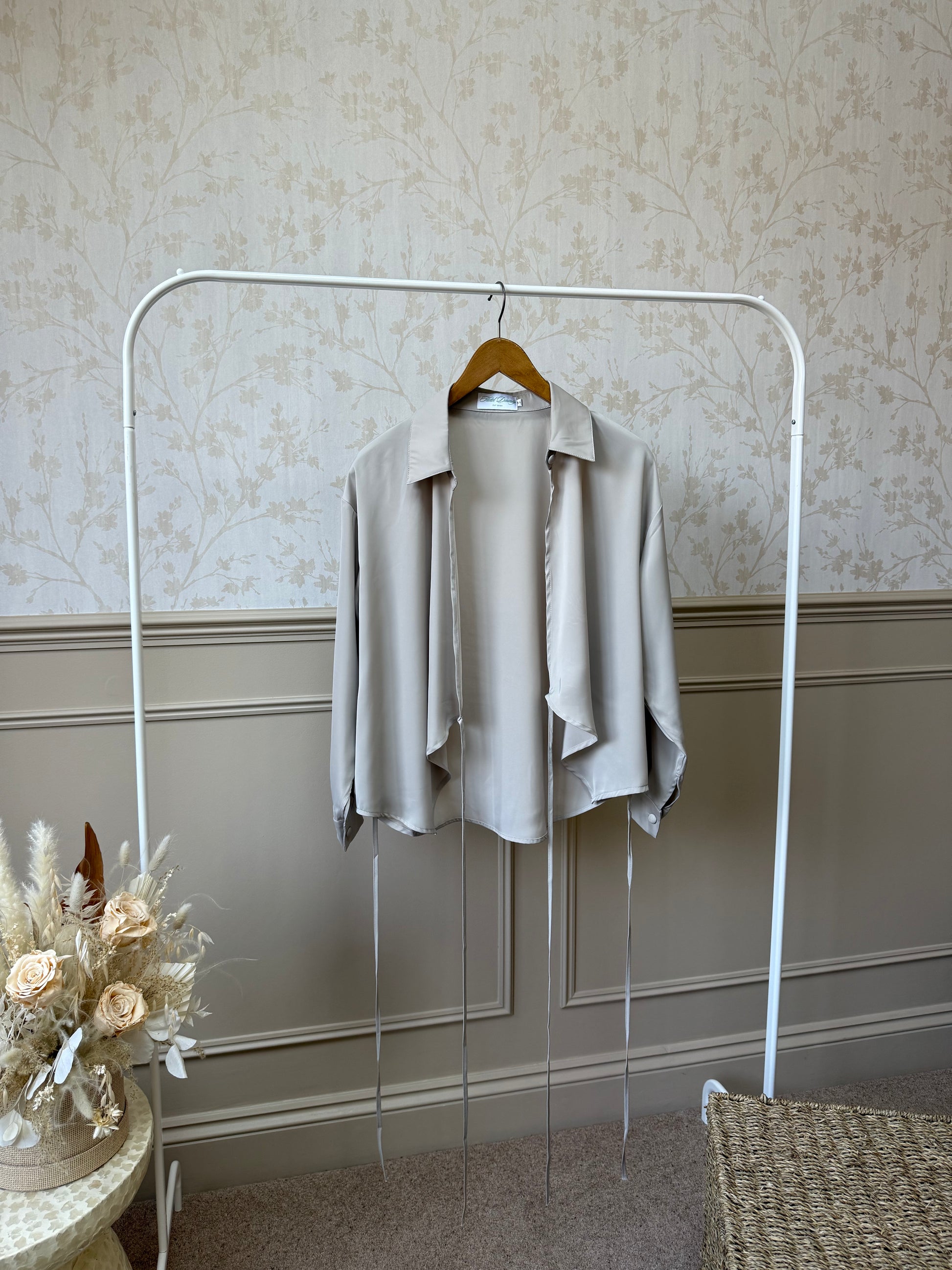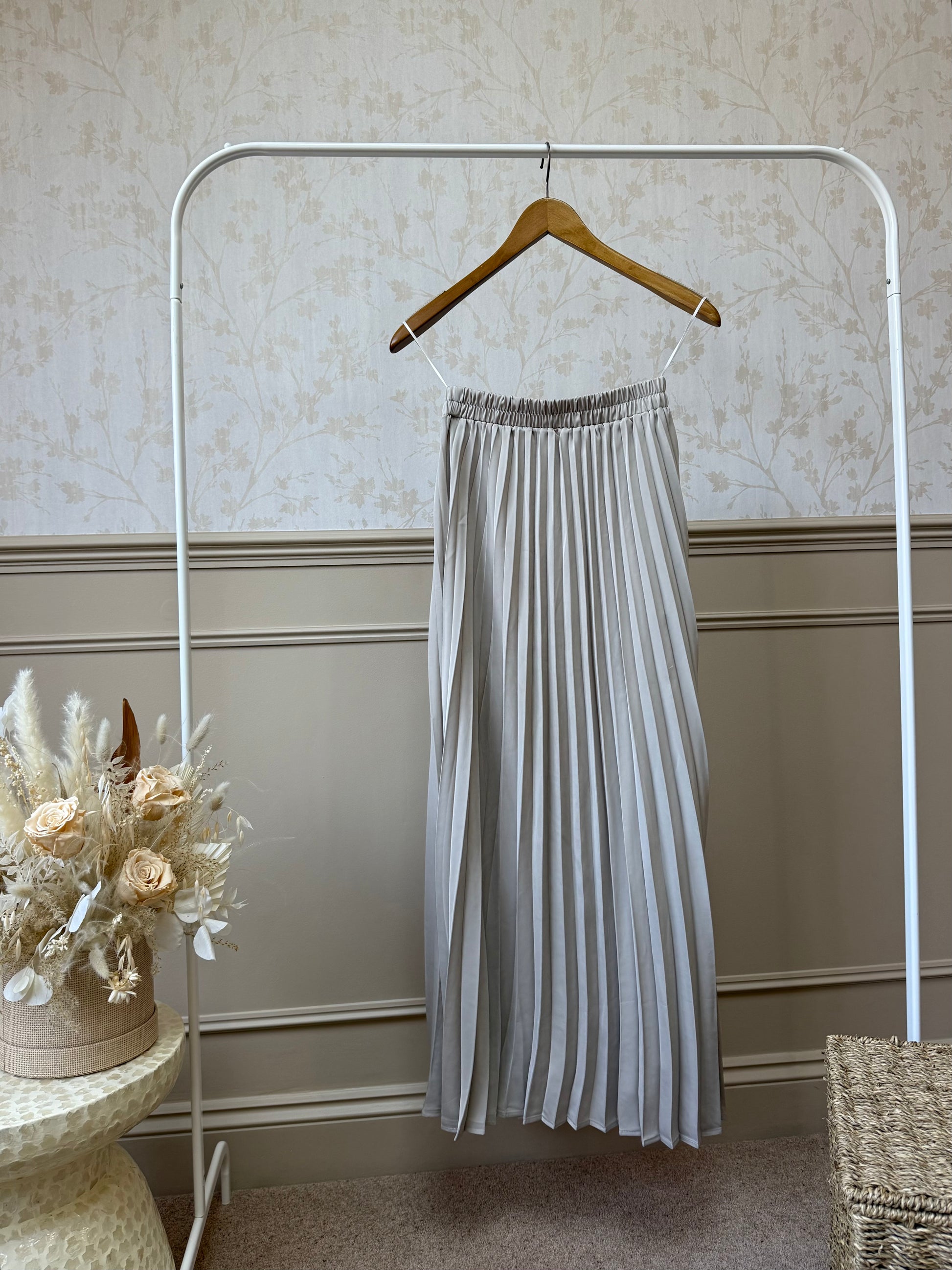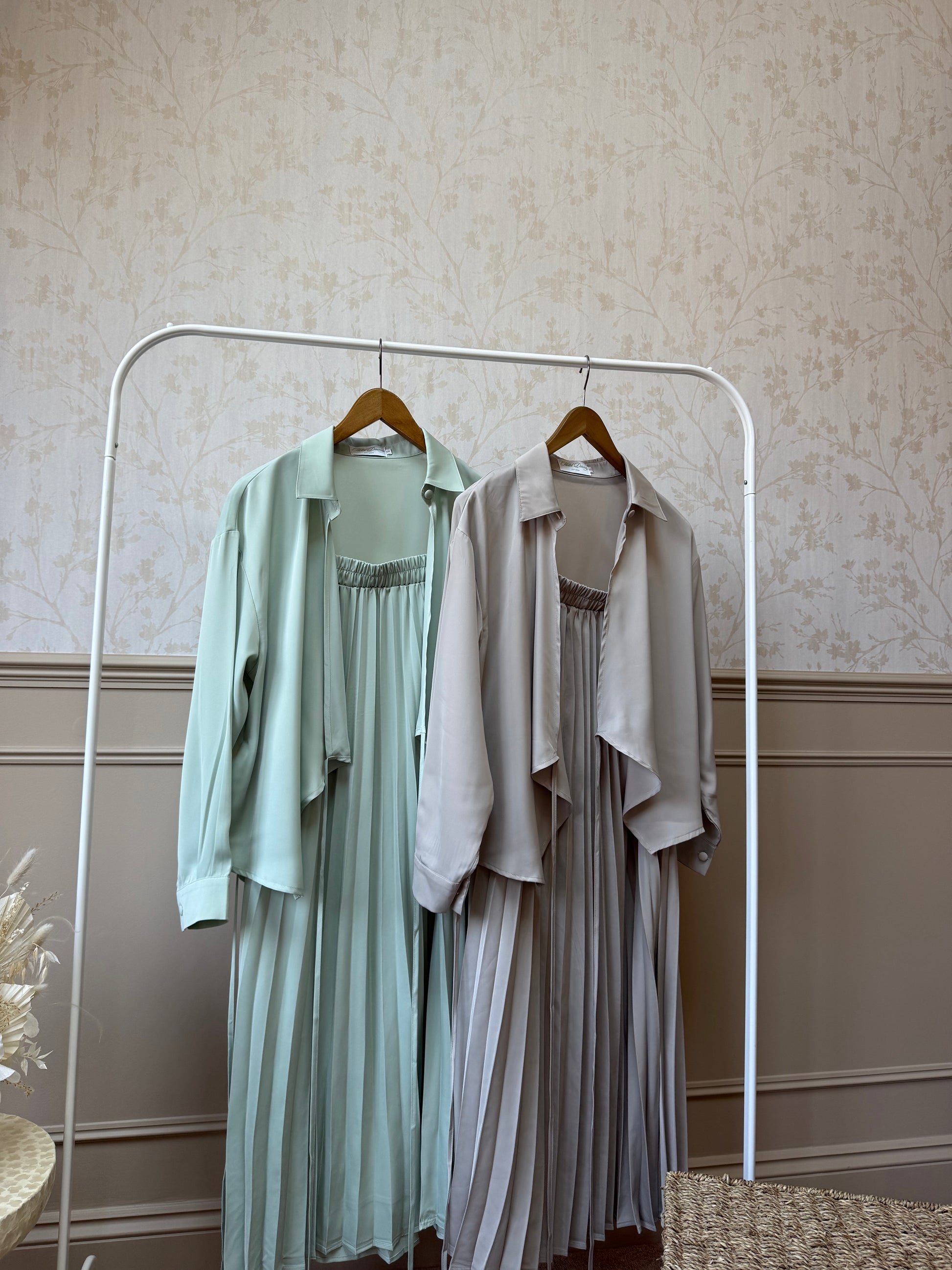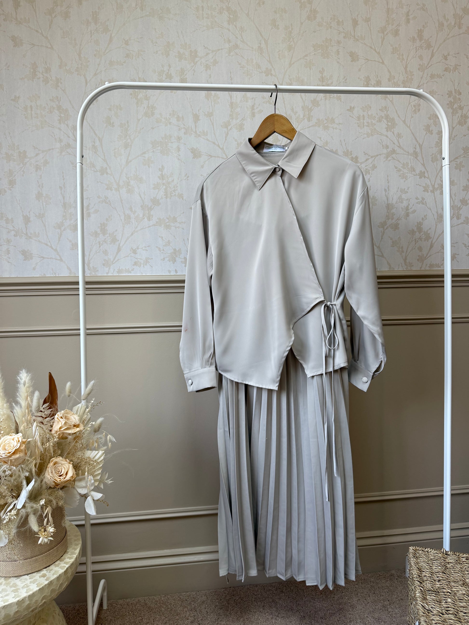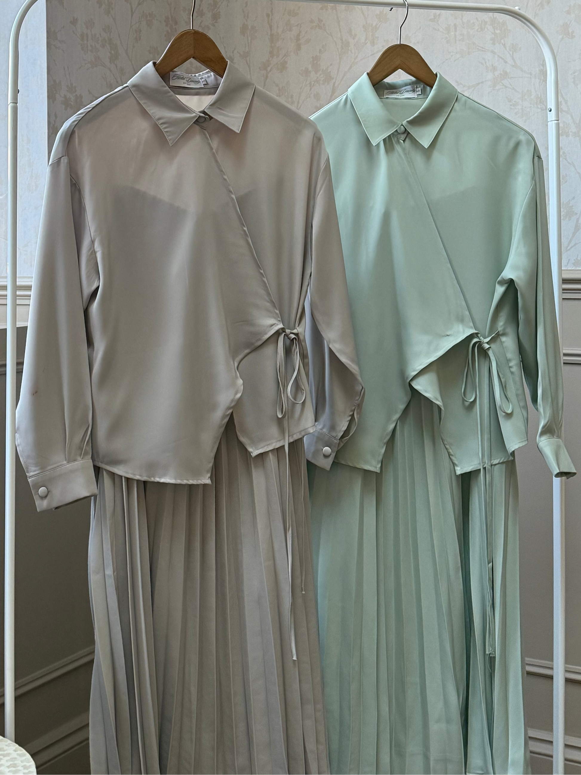 The Berkeley Set. Crafted from soft satin with a graceful sheen, this two-piece ensemble features a wrap-style blouse with delicate side ties paired with a fluid pleated skirt. The relaxed yet refined silhouette offers movement with the relaxed fit, modesty with the skirt grazing the ankles and the sleeve length, and sophistication in the choice of our carefully selected colours.